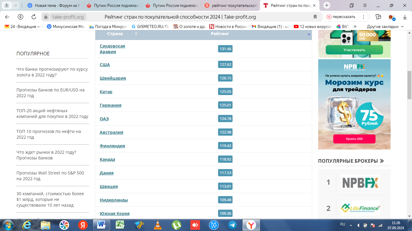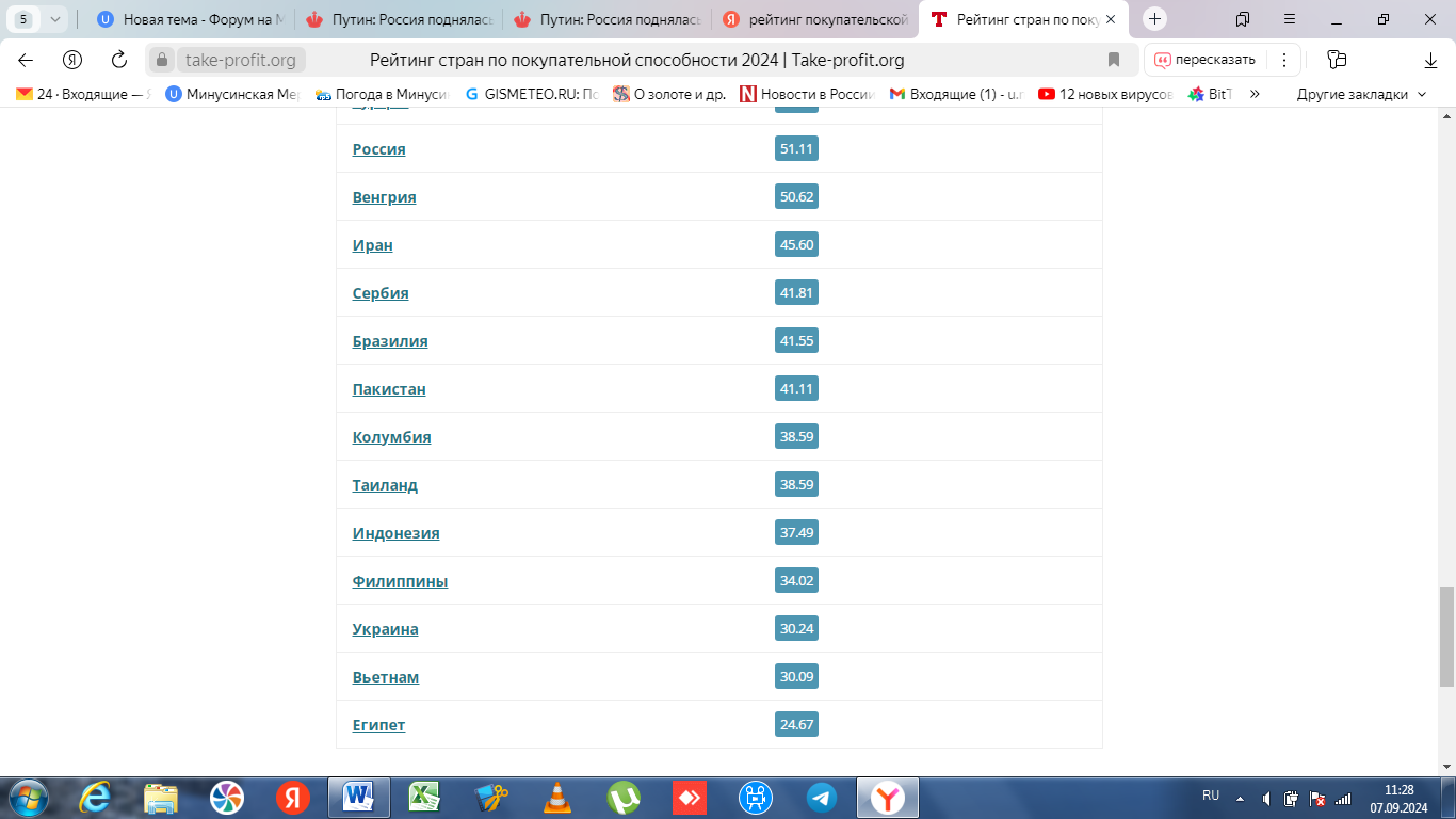Там же комментарий: 05.09.2024 14:07, #51557 Что-то не понятно: "РЕЙТИНГ СТРАН ПО ПОКУПАТЕЛЬНОЙ СПОСОБНОСТИ 2024" по: https://take-profit.org/statistics/purchasing-powe />Россия - 51,11 Саудовская Аравия - 131,46 Россия- 51,11 Египет - 24,67