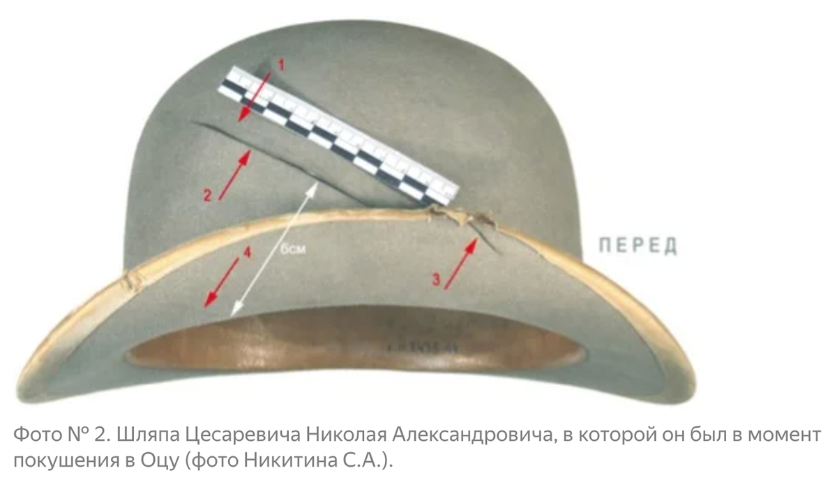 Удар сделан чрез фетровую шляпу, находившуюся на Наследнике Цесаревиче».Еще обратите внимание на белую стрелочку, показывающую расстояние между двумя порезами, равное 6 см! Эта цифра пригодится чуть позже.Далее:
