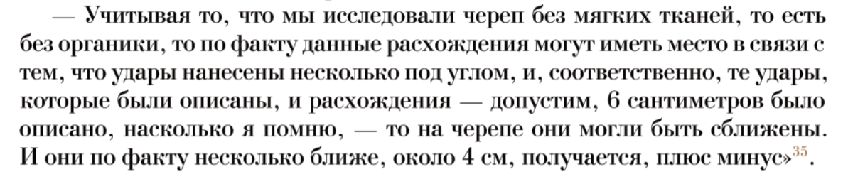 Том II, страница 451«Учитывая, что мы исследовали череп без мягких тканей, то есть без органики, то по факту данные расхождения могут иметь место в связи с тем, что удары нанесены несколько под углом, и, соответственно, те удары, которые были описаны, и расхождения — допустим, 6 сантиметров было описано, насколько я помню, — то на черепе они могли быть сближены. И они по факту несколько ближе, около 4 см, получается, плюс минус».А ничего, что вся линейка на фотографии имеет длину примерно 3,5 сантиметра, а расстояние между бороздками эксперт указывает в 4 сантиметра!!! Это как вообще понимать?! Что уж тут мелочиться. Плюс-минус мы можем так и до метра дойти.Да бросьте, вы же знаете этих врачей, им веры нет, они всегда обманут! Как можно верить каким-то хирургам Николая Второго, которые и затылок не с нужной стороны находят, и в расстояниях позволяют себе вольности. Мы же видим, что тут другие расстояния, а по условию поставленной задачи это череп Николая, значит, это не мы ошибаемся, а врачи наврали. Дело закрыто.Вернитесь к началу, посмотрите фотографию черепа и убедитесь, что между бороздками там не миллиметры, а шесть сантиметров расстояния. Это же очевидно для экспертов.Кстати, кто-то видел какой-то шрам хоть на какой-то фотографии Николая Второго в области лба? Я вот под лупой смотрел, ни разу не нашел. Шрама на лбу нет. Пореза шляпы в этом месте нет. А два удара саблей есть! Конгениально!Так вот самым волшебным образом перед шляпы превращается в зад, затылочная зона в лобную, а 2 миллиметра в 6 сантиметров. Следите за руками! Никакого мошенничества, просто магия!В принципе, дальше уже можно было бы и не продолжать. С этой экспертизой тоже все ясно. Но если интересно, то там еще много чудес и фокусов в рукавах запрятано. Могу по мере изучения докладывать.