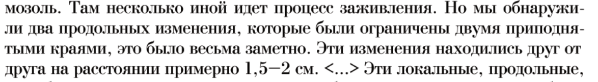 Том II, страница 446«… мы обнаружили два продольных изменения, которые были ограничены двумя приподнятыми краями, это было весьма заметно. Эти изменения находились друг от друга на расстоянии примерно 1,5-2 см...»Вы видите там 2 сантиметра? Я вот никак не вижу. Но дальше — больше! К странице 451 это расстояние превращается в целых 4 сантиметра.
