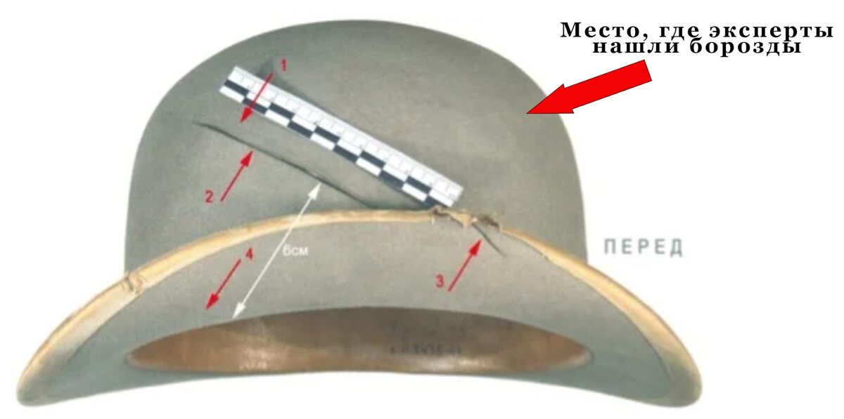 И вот уже как-то получается, что места разрезов удивительно не совпадают с торжественно найденными экспертами бороздками. Ведь обе бороздки находятся на лобной части черепа, а порезы у шляпы совершенно недвусмысленно на затылочной.
