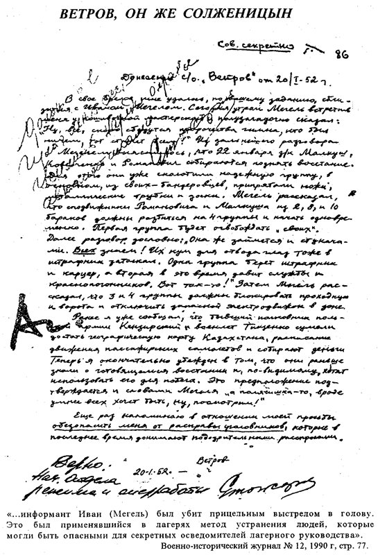 Но не тут-то было. Не рассчитал Акела, промахнулся и «загремел». В лагере Солженицын стал заниматься доносительством, не бедствовал, и получил оперативную кликуху «Ветров». В «Военно-историческом журнале» №12 за 1990 год опубликован чрезвычайно любопытный документ, который позволяет нам оценить по достоинству якобы «живущего не по лжи» Солженицына.